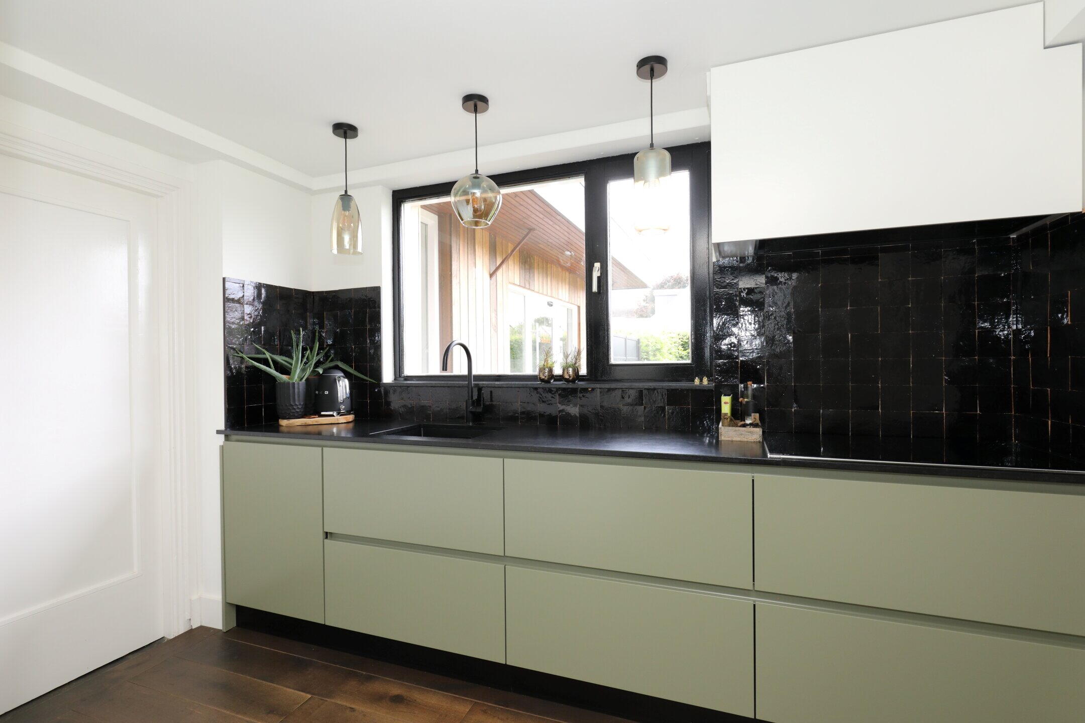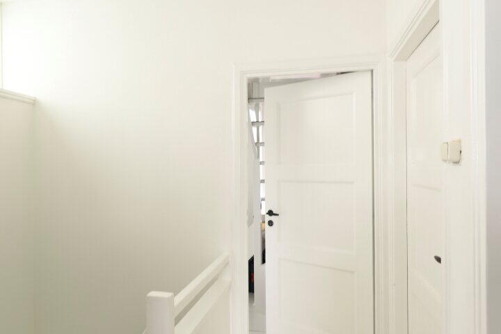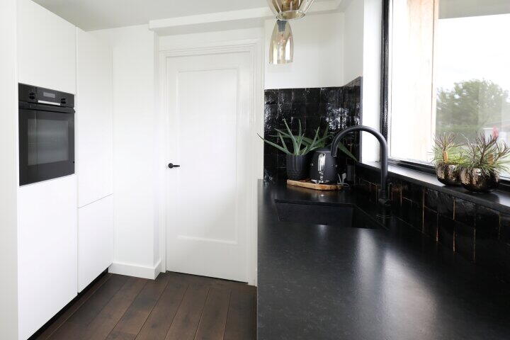 - Achter de keuken bevindt zich de bijkeuken met een maatwerk kastenwand met keurig weggewerkte witgoedaansluitingen en een elektrisch verwarmde boiler.
