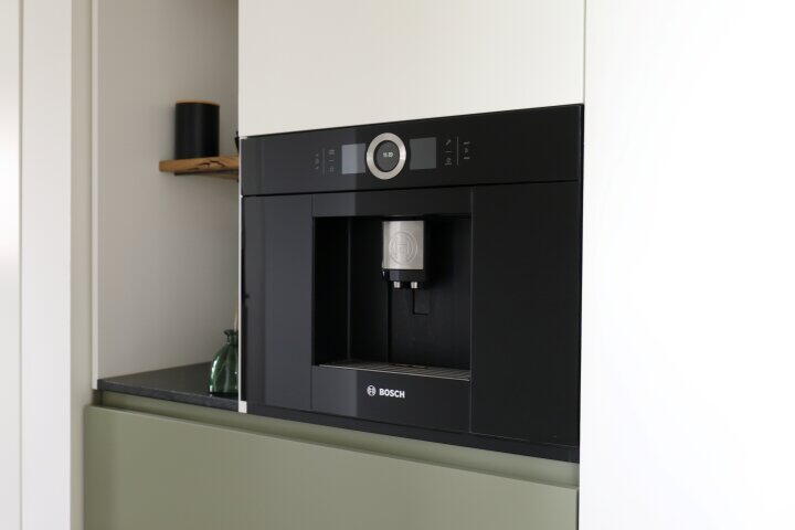 * Ingebouwde koffiemachine in een aparte gezellige koffiehoek Alle keukenapparatuur is slim en op afstand te bedienen via een app — ideaal voor het moderne huishouden.